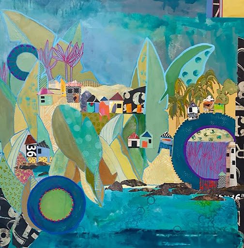 My bigger-than-life, whimsical portraits of women of a certain age; my beach scenes of cottages, palm trees and crystal blue skies are easily recognizable with my signature bold colors and simple descriptive lines. The distinctive characteristics of my work are also obvious in my architectural abstracts, rendered in mixed water media or oils. In my recent works, I layer acrylics or oil paints, collage materials, and cold wax on wood panels, creating textures reminiscent, perhaps, of old ruins and secret passages.