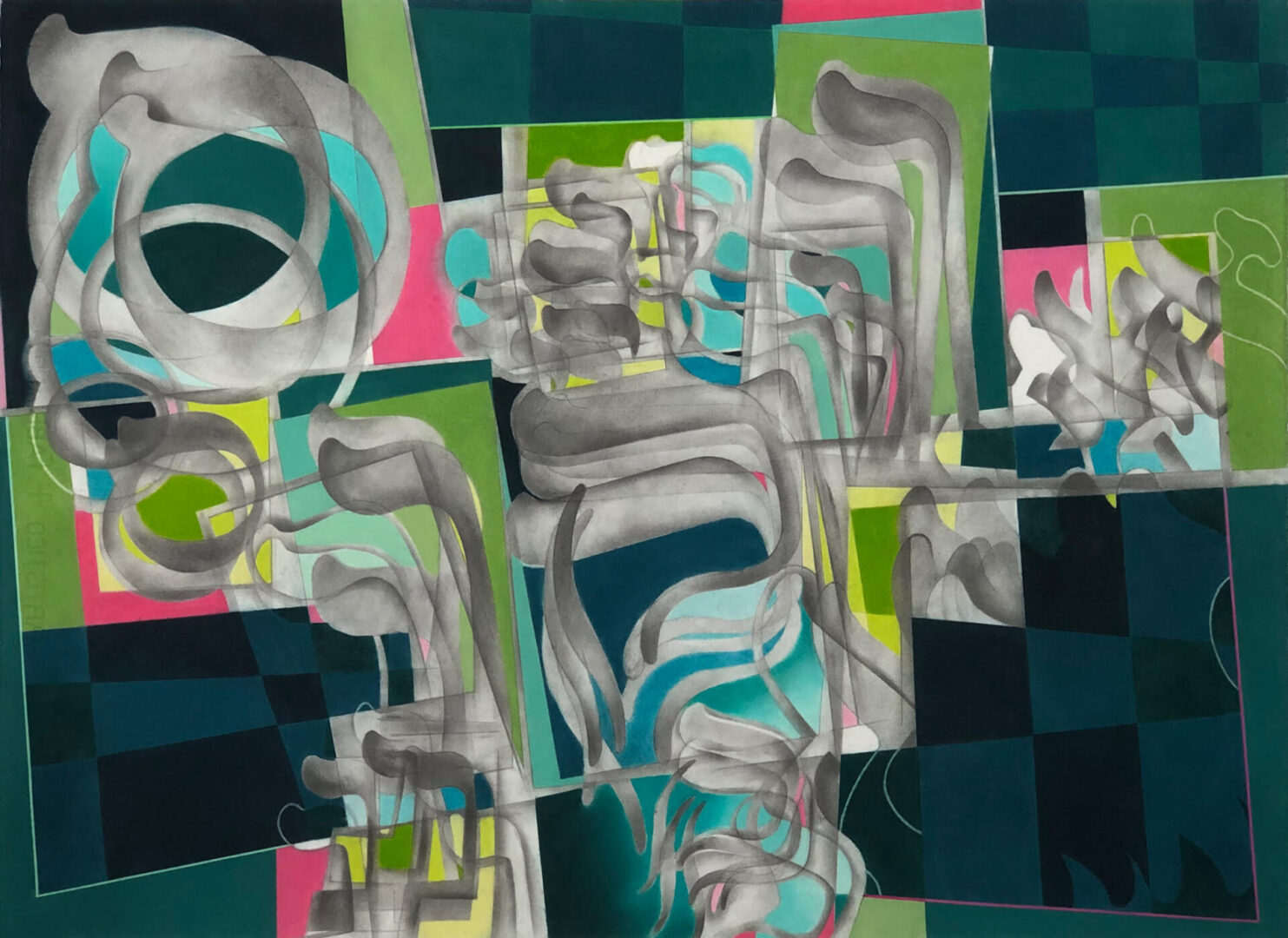 Who are we? How much do we conceal? Kate Hendrickson’s inquiry begins with the history of the Crypto-Jews/Conversos hiding their identity to protect themselves. However, despite concealing who they were, bits were still revealed. Her artwork explores and reconciles feelings of discomfort within revealing that Judaism is the faith she has chosen. How much does she reveal? As you look closer at her works on paper, you will see that there are pieces of concealed Hebrew words peeking out and revealing themselves from their surrounding abstracted urban and natural environs. Her hope is that her drawings help everyone feel more comfortable proudly expressing who they really are.