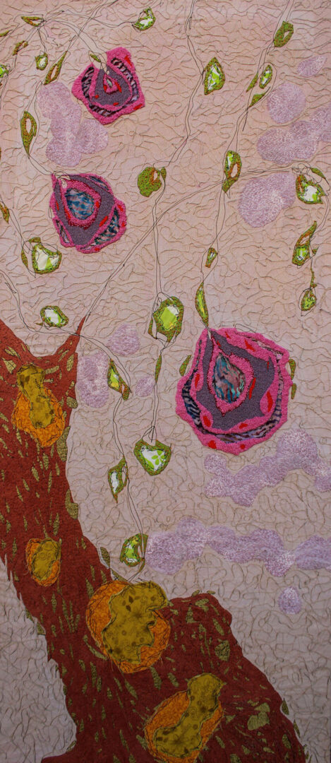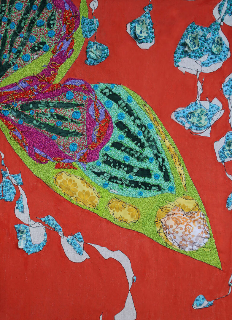 I continue to build and layer on this initial imagery by using paint and colorful fabric. Lastly, I use hand stitching to emphasize more patterns and textures. In the end, I desire to take the viewer on a visual journey of internal beauty. Allowing the eye to move and flow as if they become part of the inner beauty and subconscious. Evoking a sense of beauty and peace as if stepping inside nature.