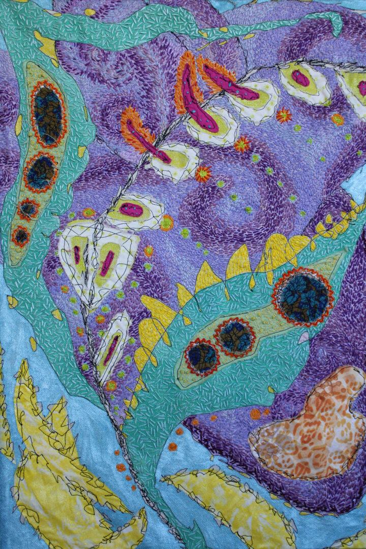 My abstract art is inspired by nature. My inspiration is not what one can see with the human eye, but the patterns, textures, and colors beyond. I strive to visually capture the beauty inside. The initial imagery of my artwork begins with instinct. Tapping into my inner self and my strong connection with nature, I use the sewing machine to draw and capture the movement and flow of my subconscious.