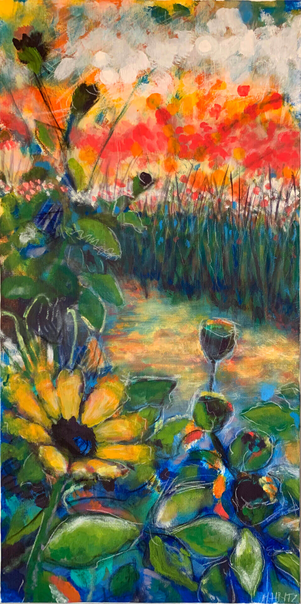My large canvas painting approach is both impressionistic and expressive. Working with mixed media, I look for the perfect balance between applied paint, charcoal scribbles, and oil pastel marks. These large format captures of nature are alive with vivid brushwork and washes of color.