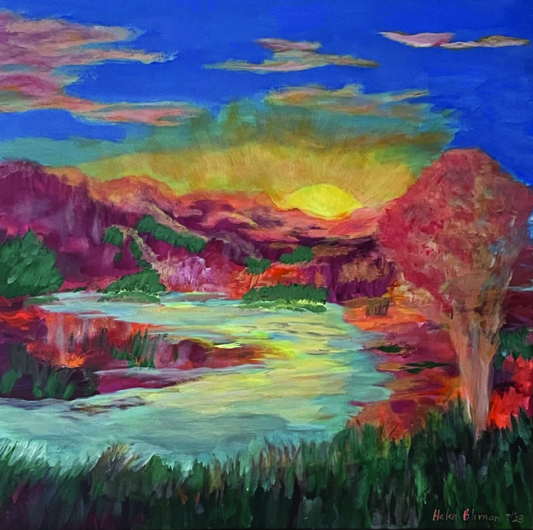 I have loved paintings and Art since my Humanities courses in college.  But being an artist was not on my mind.   I taught elementary school children for several years, followed by a satisfying 2nd career as a Licensed Marriage and Family Therapist.  For many years I was a photographer as a hobby. Without realizing it, I was using artistic techniques to photograph the world, near and far—framing and composing my photos as my world and experiences expanded.  I have enlarged many of my photos and they are hanging in my home as well as my children’s homes.